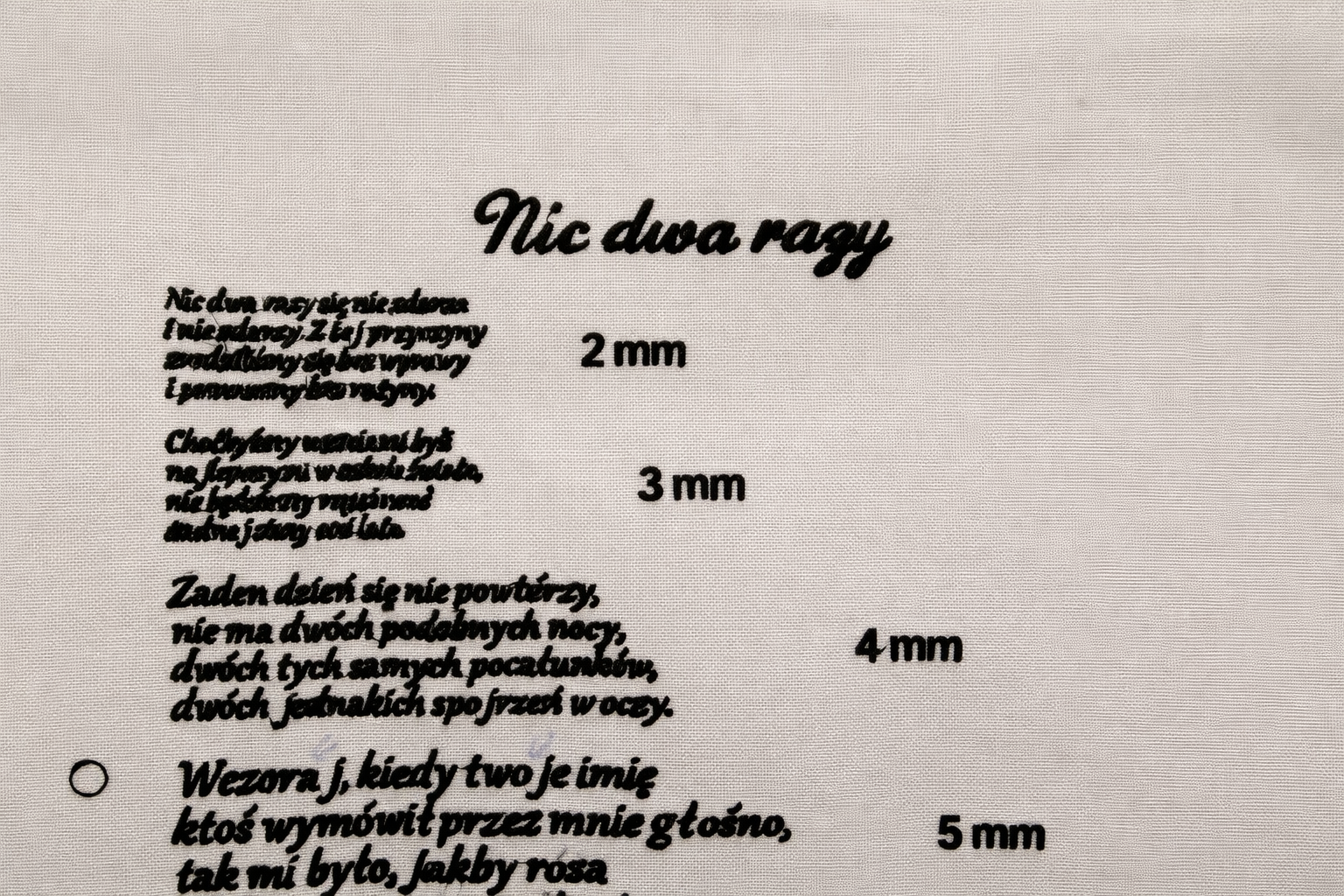 Jednym z najczęstszych problemów w hafcie są napisy. Klient widzi je wyraźnie na monitorze, ale po zmniejszeniu do rzeczywistego rozmiaru haftu okazuje się, że litery są za małe albo zbyt blisko siebie. Aby litery były czytelne, muszą mieć min. 4 mm wysokości.