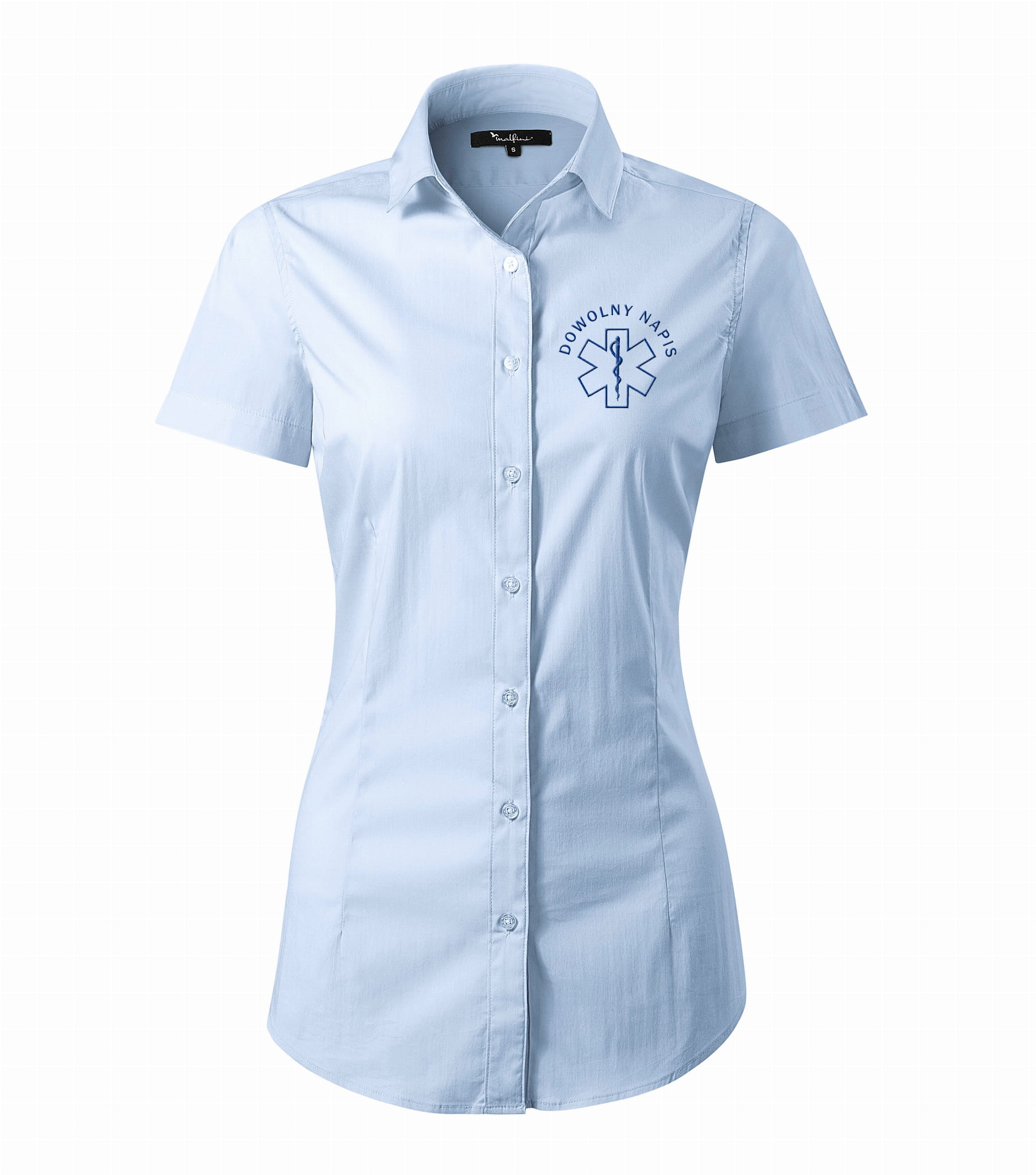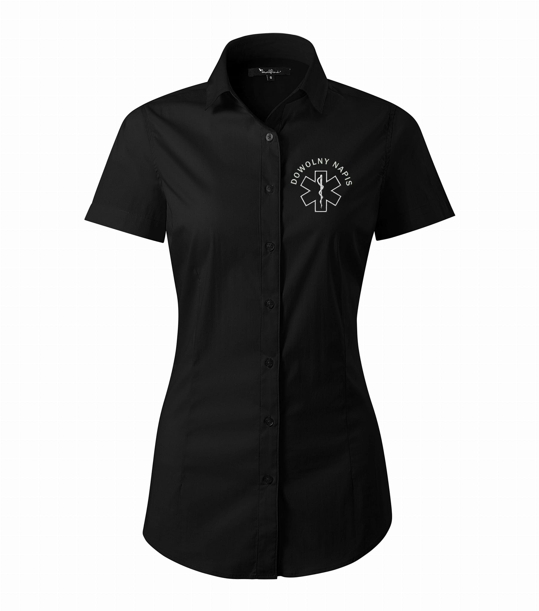 Koszula damska medyczna 261 Malfini z dowolnym napisem to elegancki i estetyczny element damskiej garderoby personelu medycznego. Na bluzce damskiej zostanie wykonany haft eskulap oraz dowolny napis przez Państwa wskazany. Na koszuli medycznej możemy wyhaftować dodatkowe napisy z przodu, na rękawach oraz na plecach.