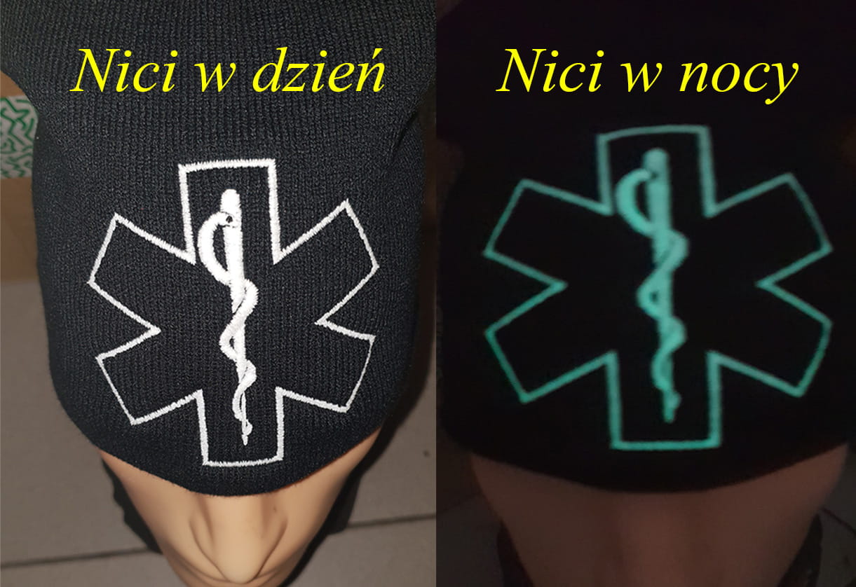 - Napis STRAŻ LUNA (napis biały, ramka biała nićmi święcącymi w ciemności zielonkawym światłem) - Uwaga za nici świecące dopłata 20 zł.