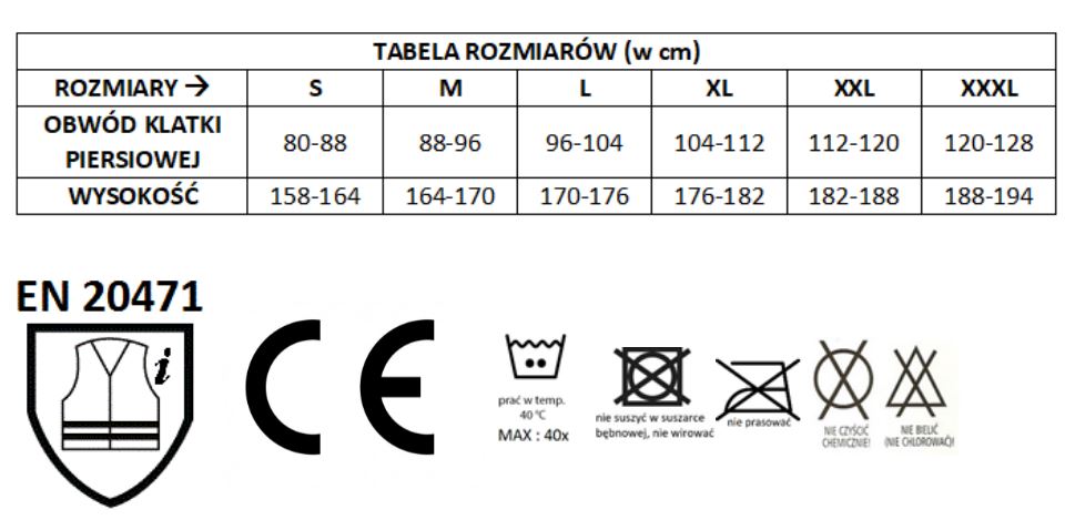 Kamizelki ostrzegawcze są zgodne z Dyrektywą 89/686/EEC i normą EN 20471:2013.