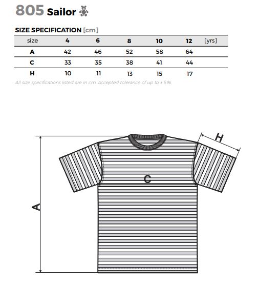 Koszulka dziecięca w biało-granatowe paski, idealna na żagle. Praktyczna koszulka tshirt dziecięca z krótkim rękawem w paski Sailor 805 Malfini. Jest to koszulka bawełniana z wykończeniem silikonowym bardzo dobrej jakości.