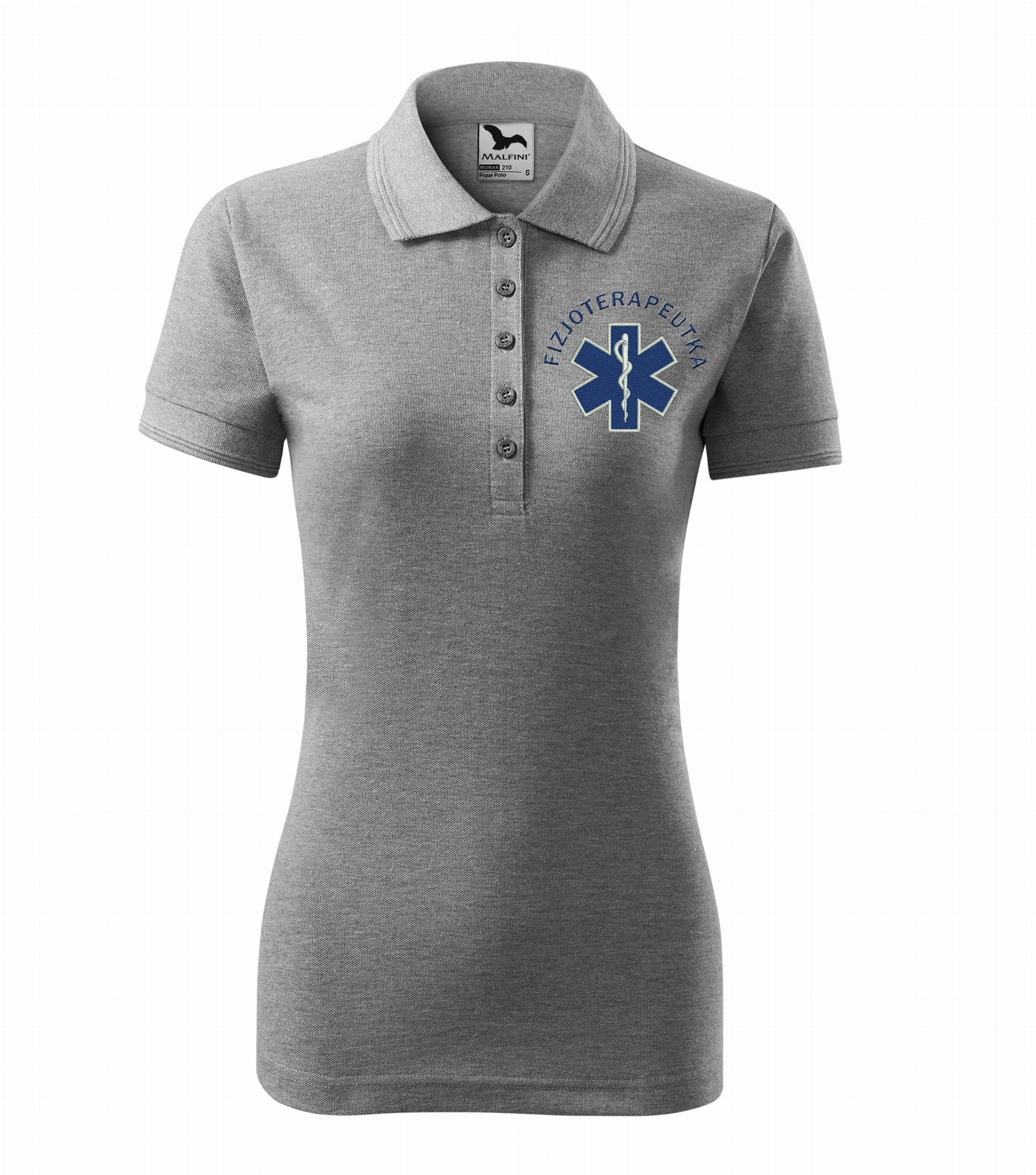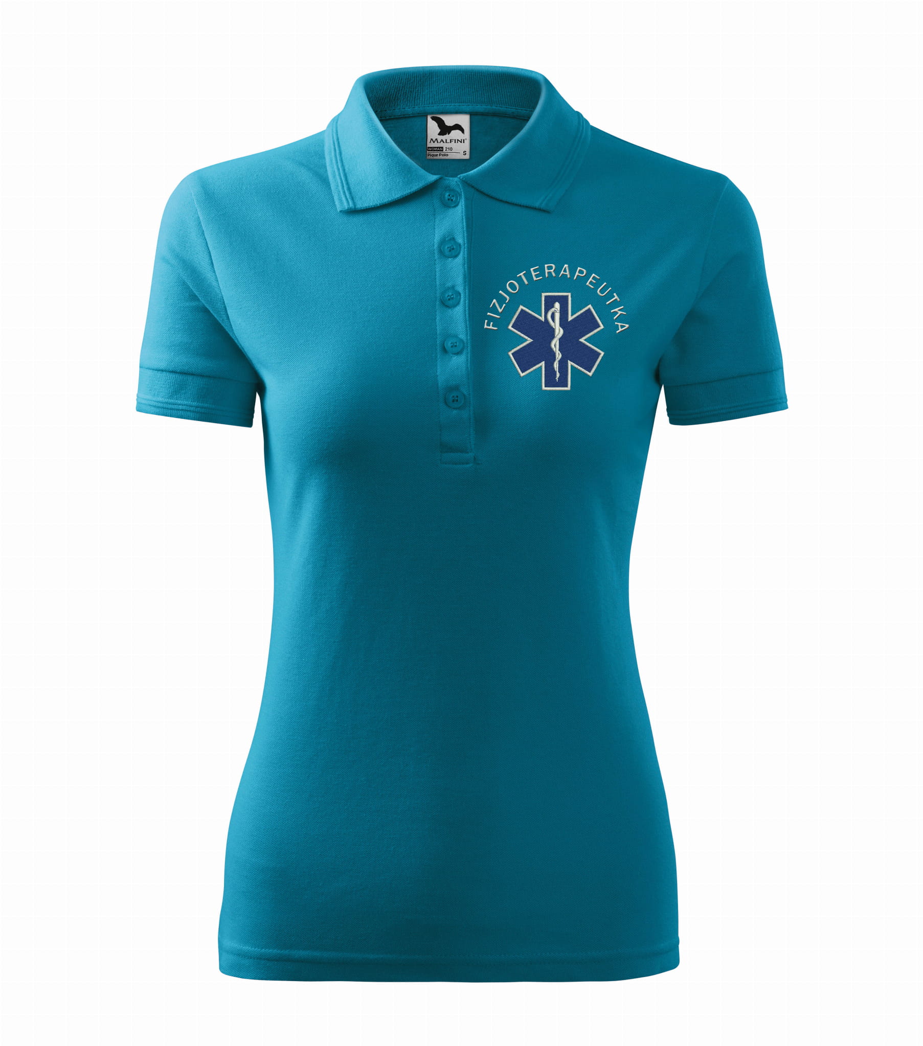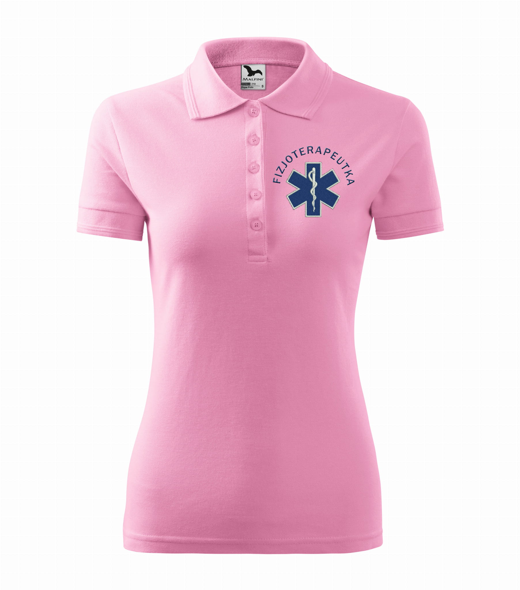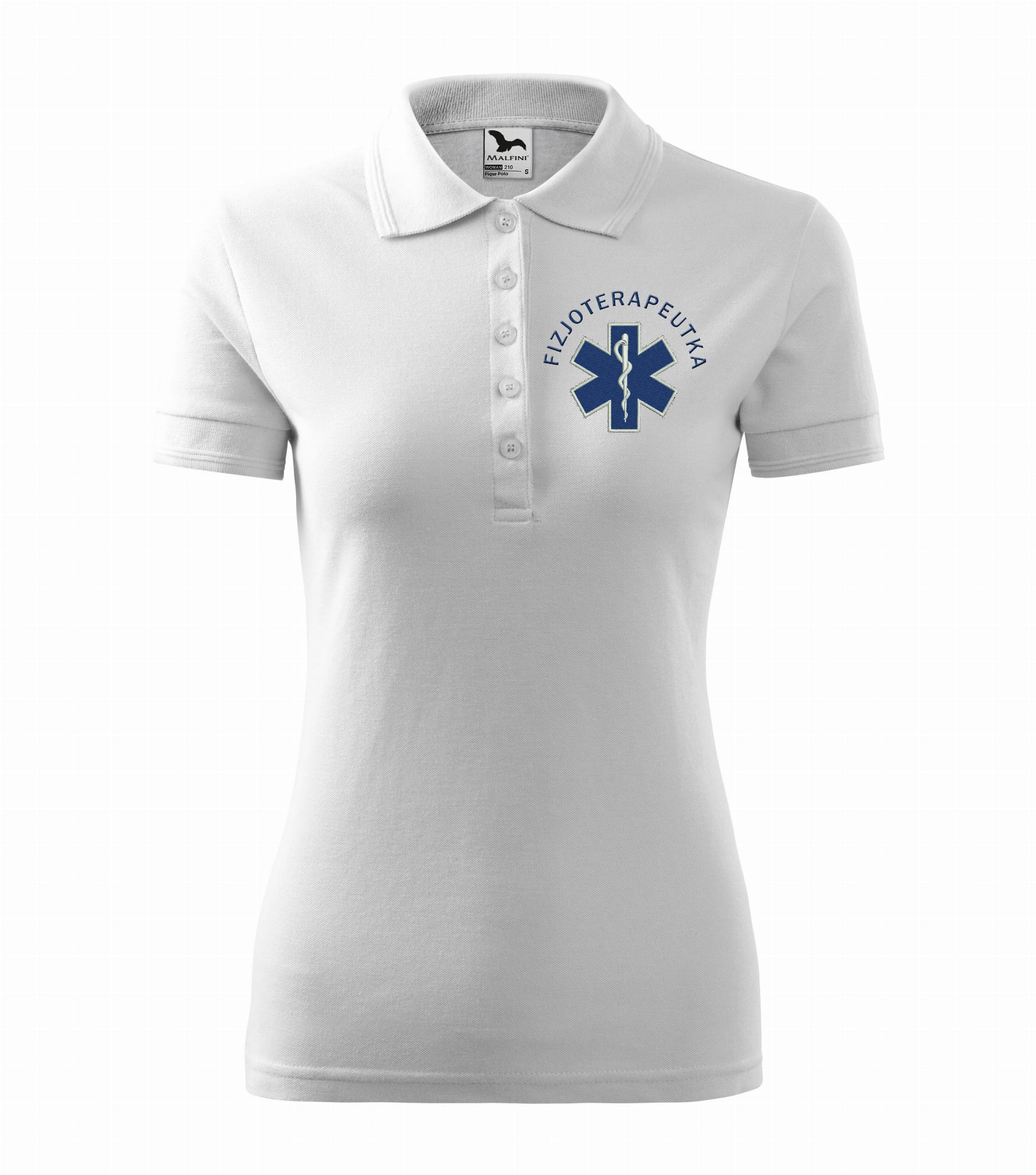 Koszulka polo medyczna damska dla fizjoterapeutki to estetyczna część garderoby damskiego personelu medycznego. Baza, na której został wykonany haft eskulapa z napisem fizjoterapeutka, to damska koszulka polo firmy Malfini. Każdy produkt jest przygotowywany indywidualnie, co daje możliwość wykonania każdej koszulki zgodnie z projektem klienta, który zawiera dowolne napisy takie jak np: Imię i nazwisko, nazwa placówki medycznej, oddział itp.