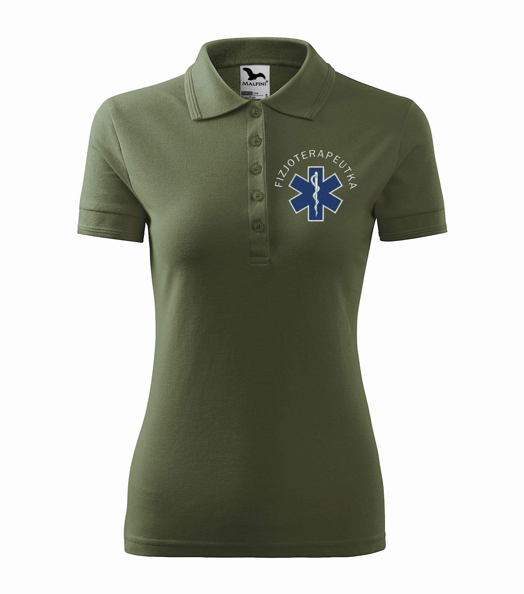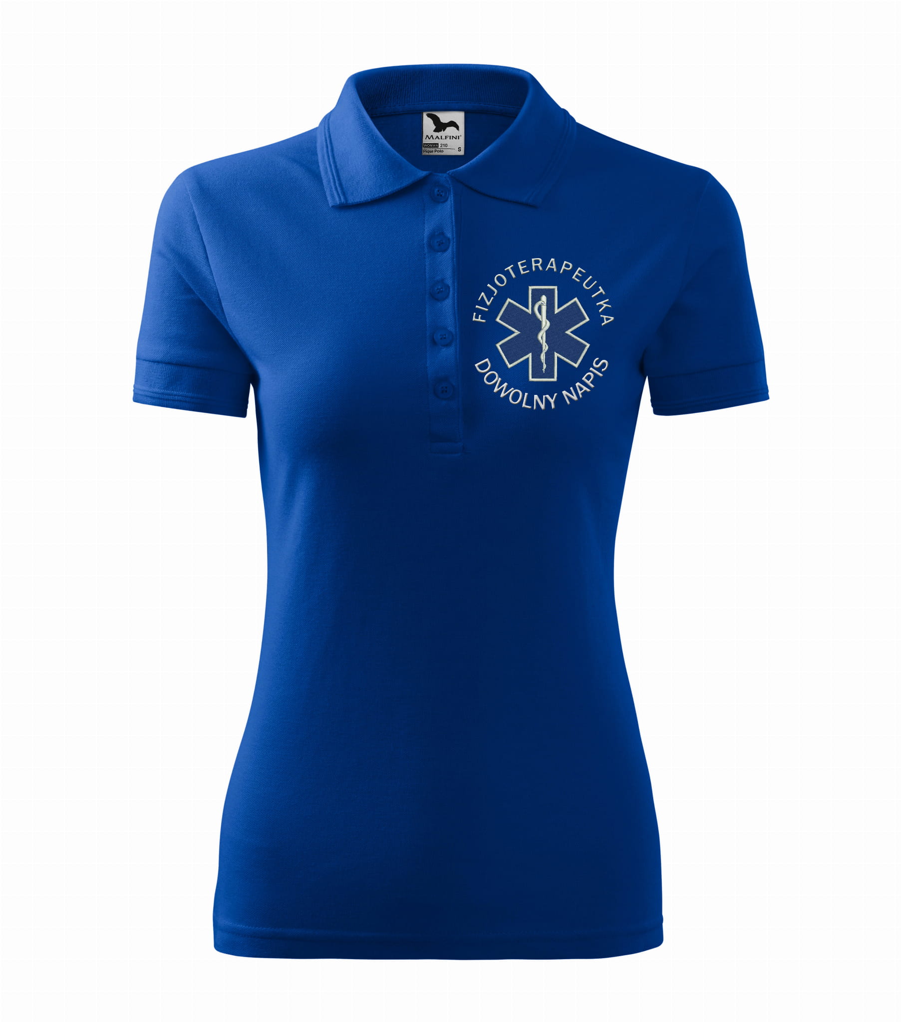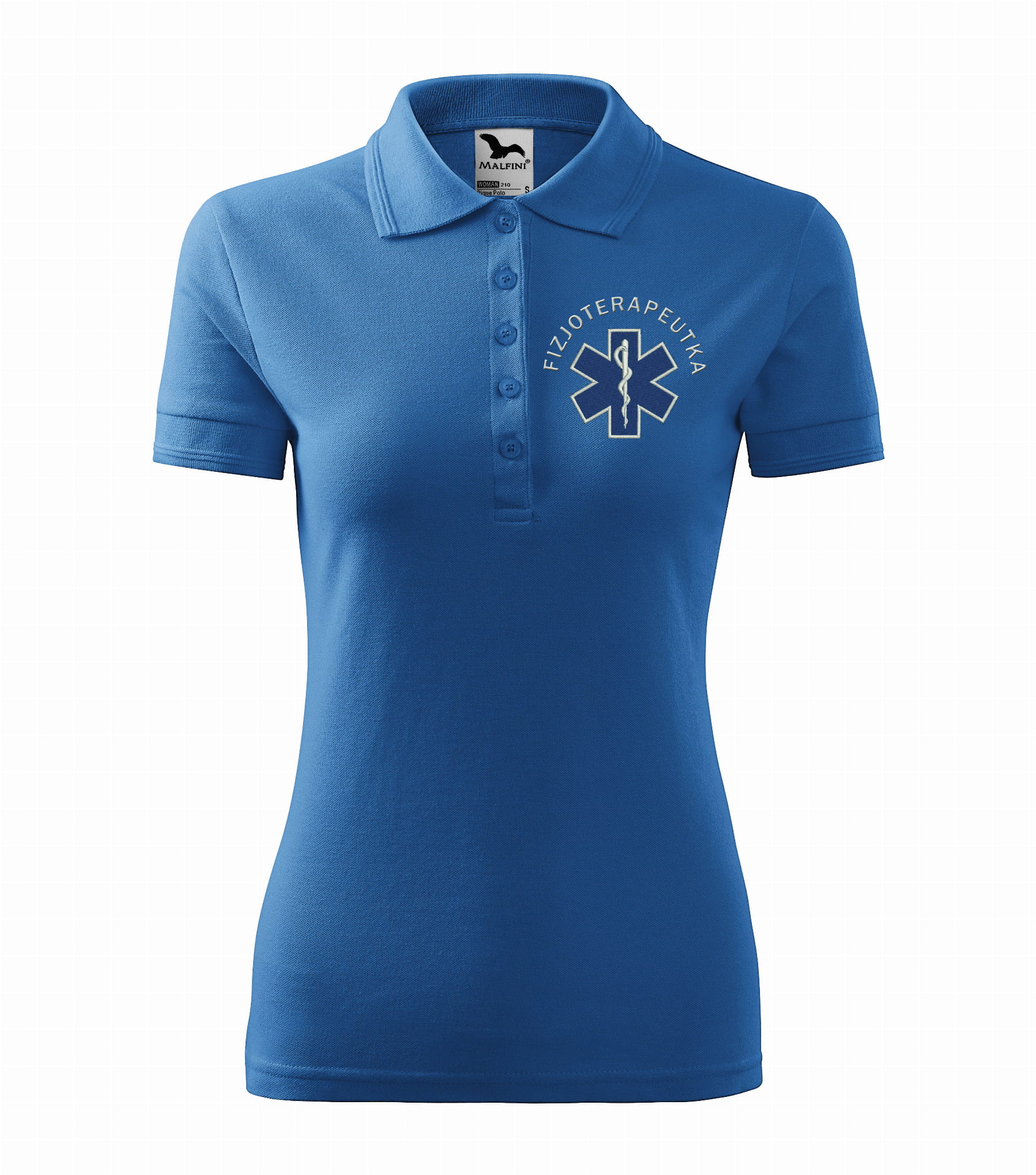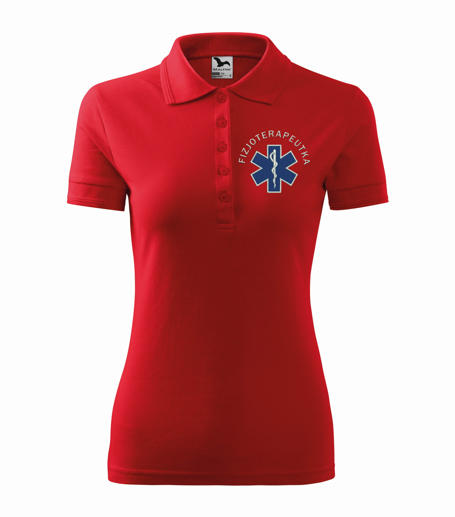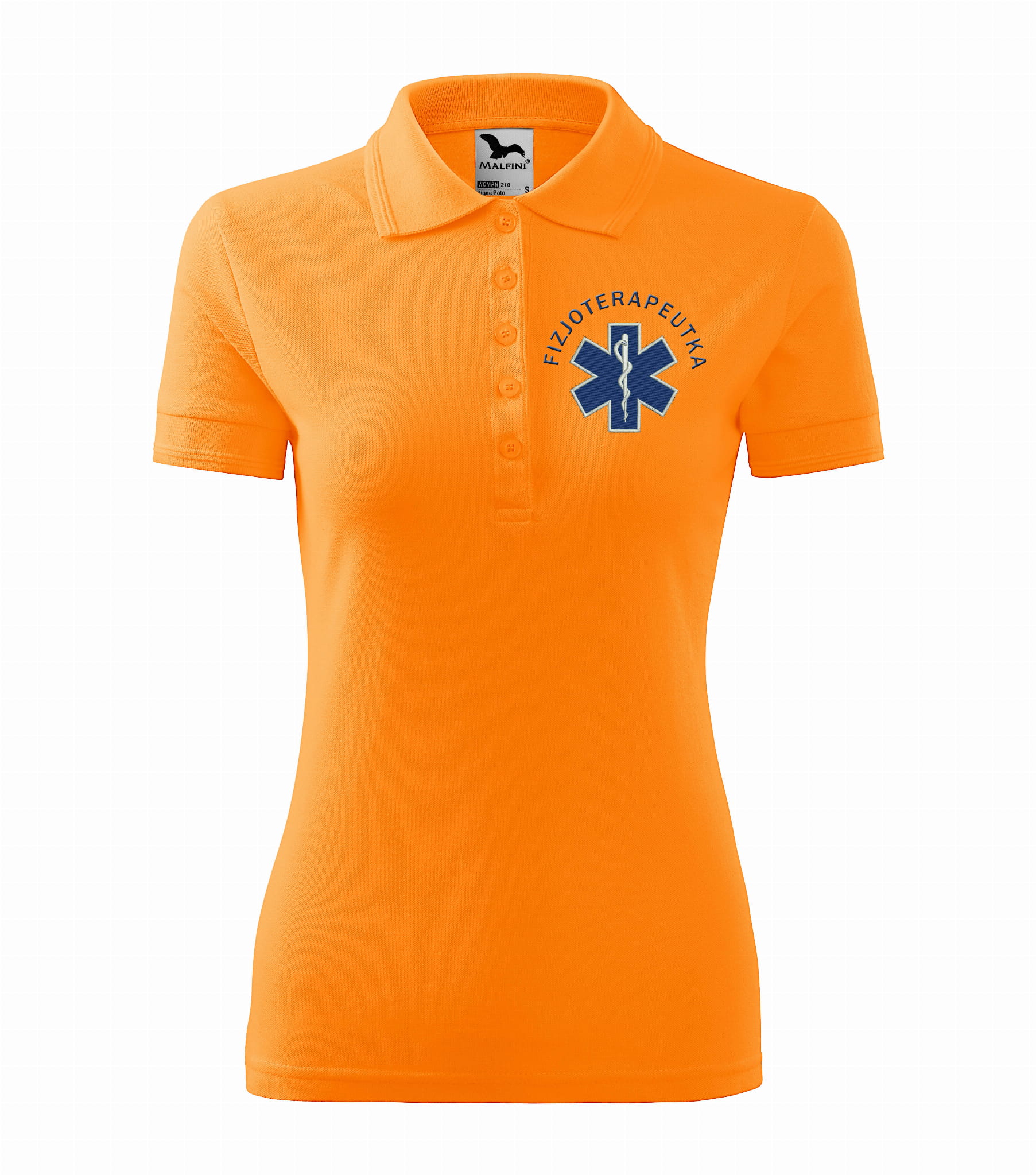 Koszulka polo medyczna damska dla fizjoterapeutki to estetyczna część garderoby damskiego personelu medycznego. Baza, na której został wykonany haft eskulapa z napisem fizjoterapeutka, to damska koszulka polo firmy Malfini. Każdy produkt jest przygotowywany indywidualnie, co daje możliwość wykonania każdej koszulki zgodnie z projektem klienta, który zawiera dowolne napisy takie jak np: Imię i nazwisko, nazwa placówki medycznej, oddział itp.