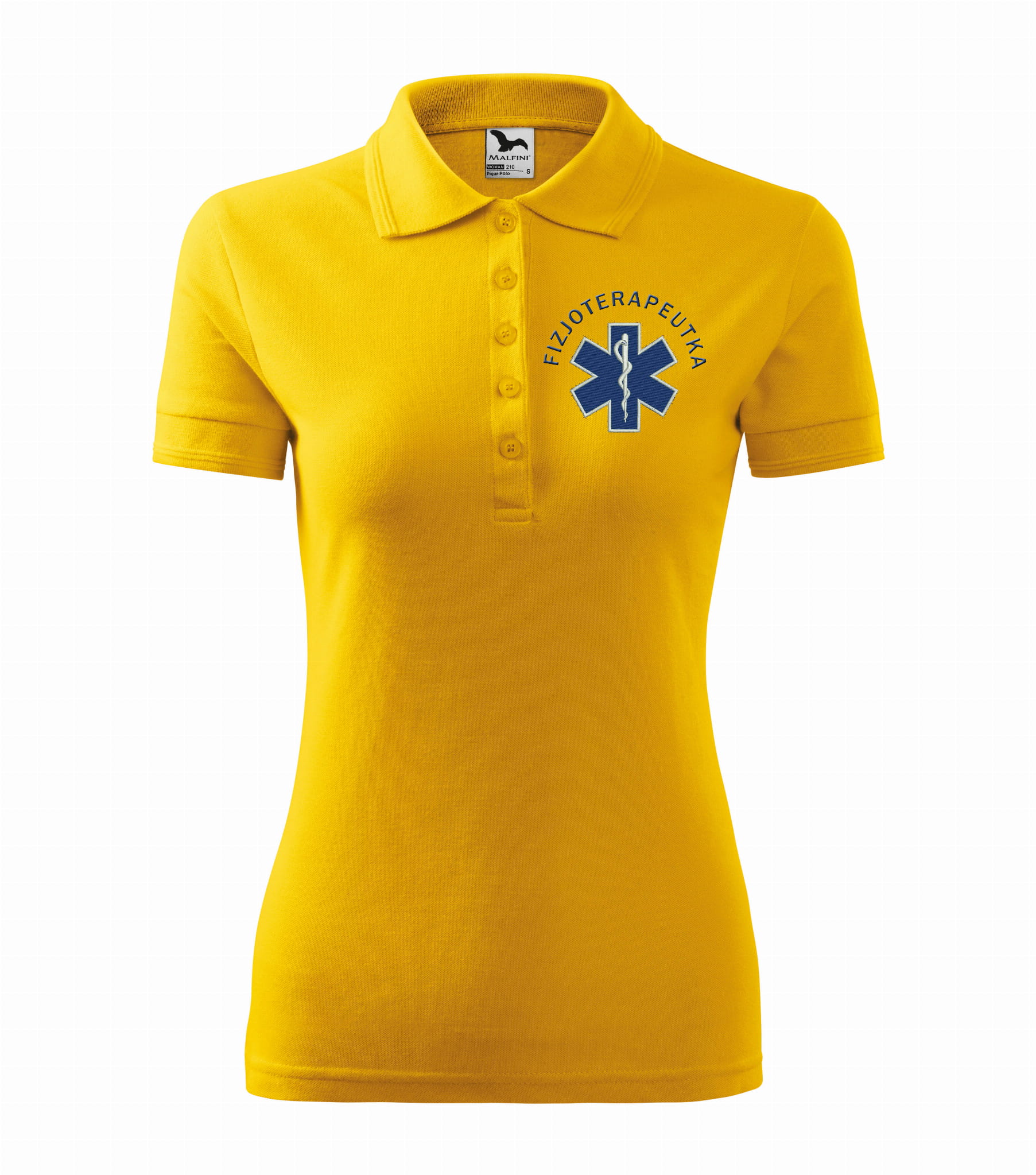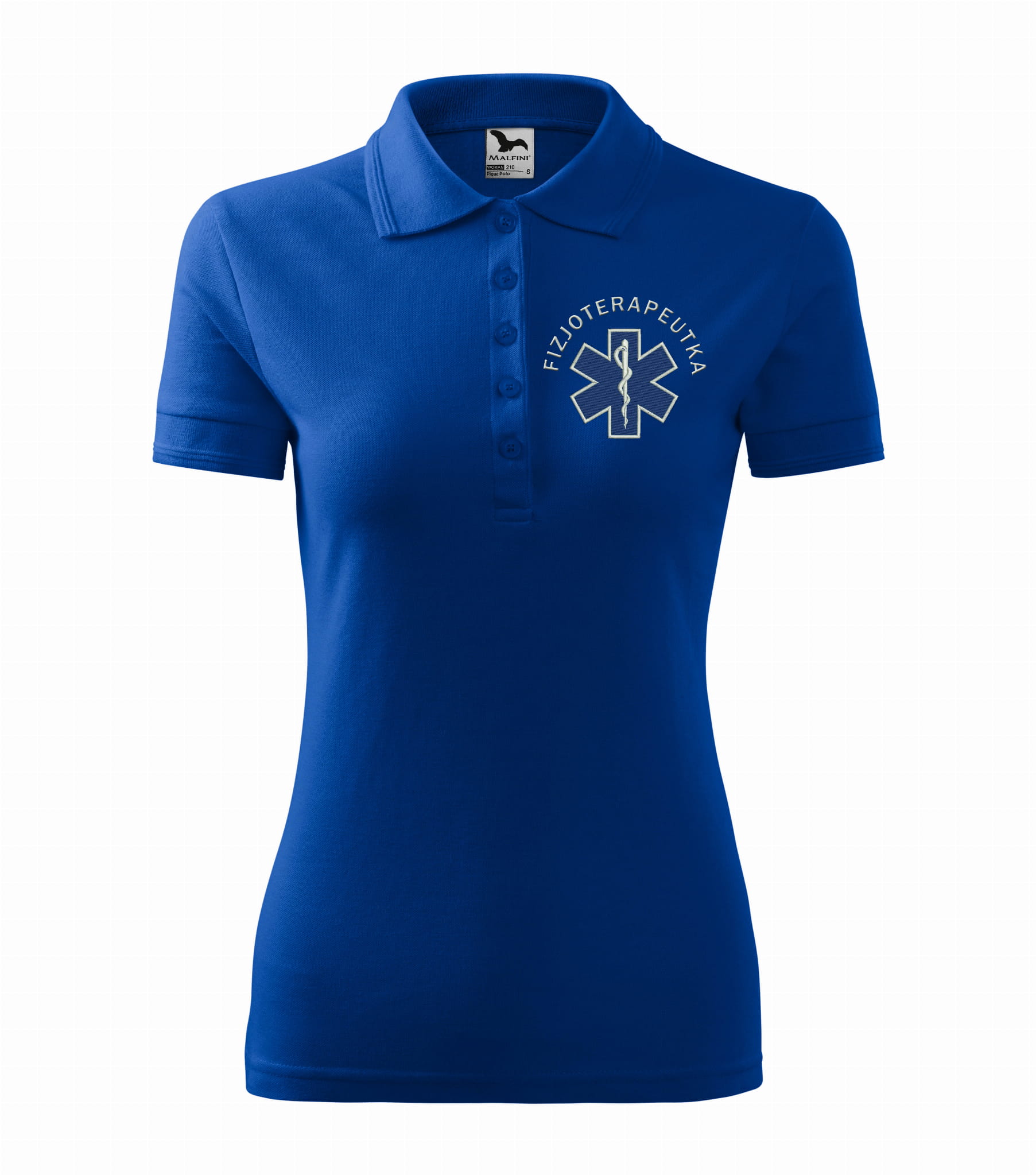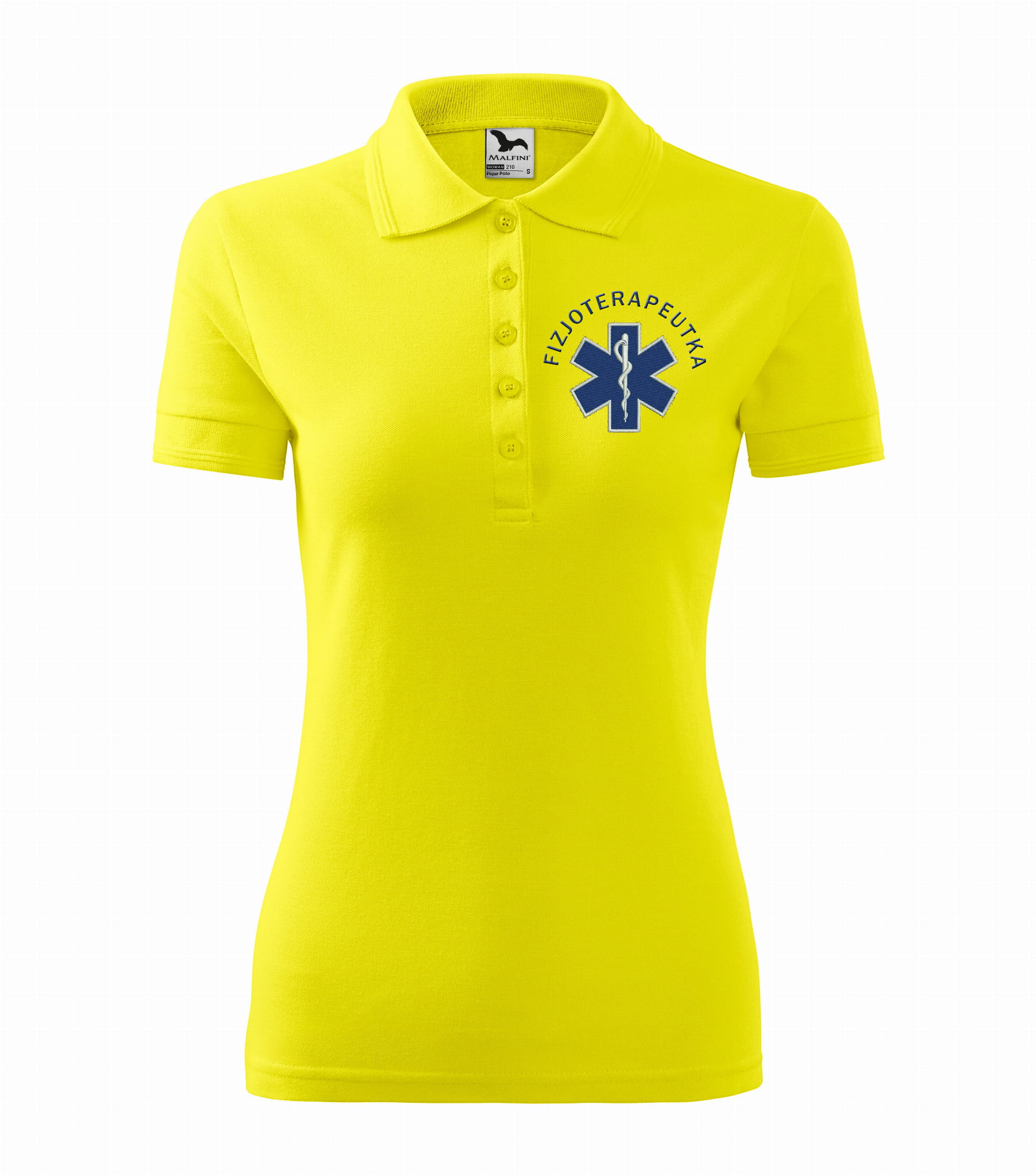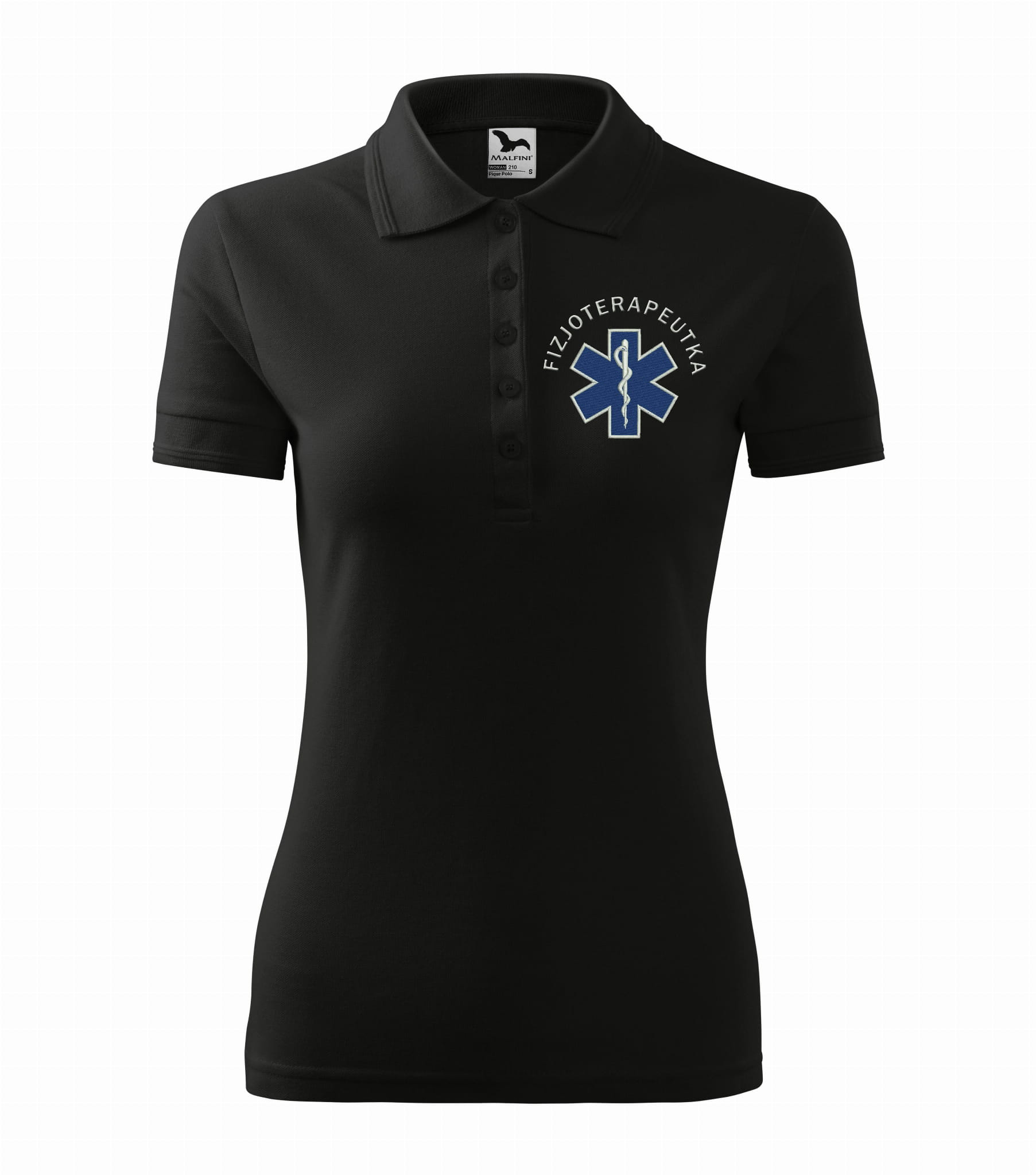 Koszulka polo medyczna damska dla fizjoterapeutki to estetyczna część garderoby damskiego personelu medycznego. Baza, na której został wykonany haft eskulapa z napisem fizjoterapeutka, to damska koszulka polo firmy Malfini. Każdy produkt jest przygotowywany indywidualnie, co daje możliwość wykonania każdej koszulki zgodnie z projektem klienta, który zawiera dowolne napisy takie jak np: Imię i nazwisko, nazwa placówki medycznej, oddział itp.