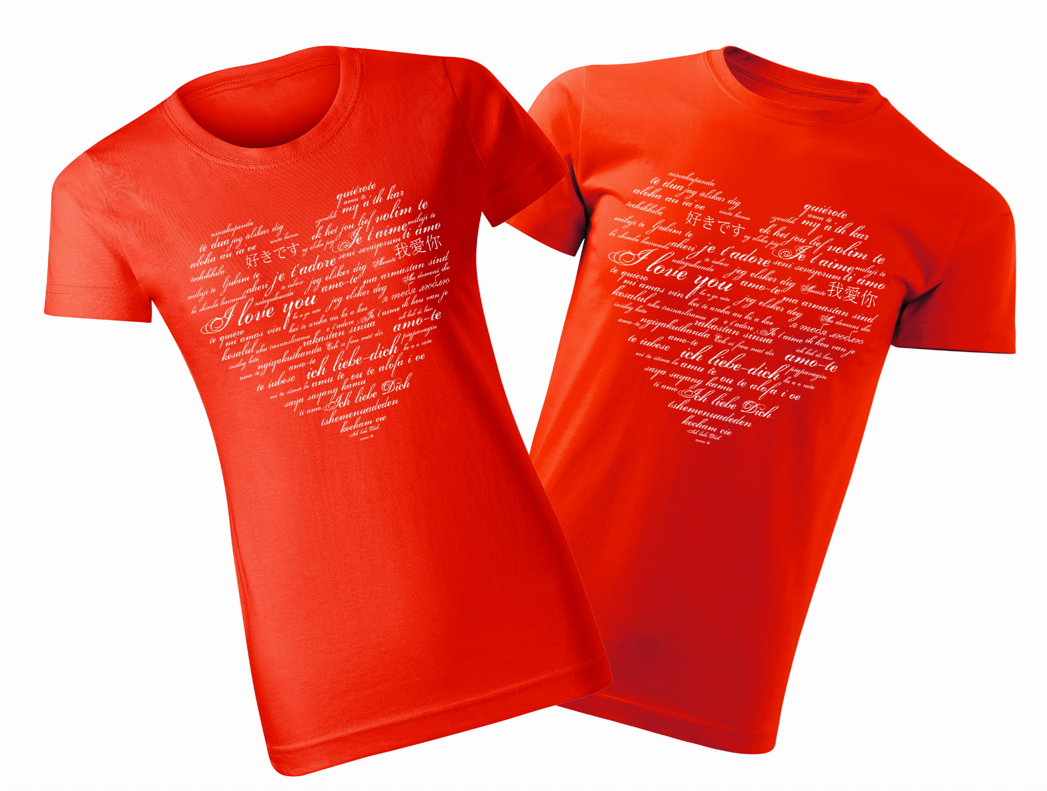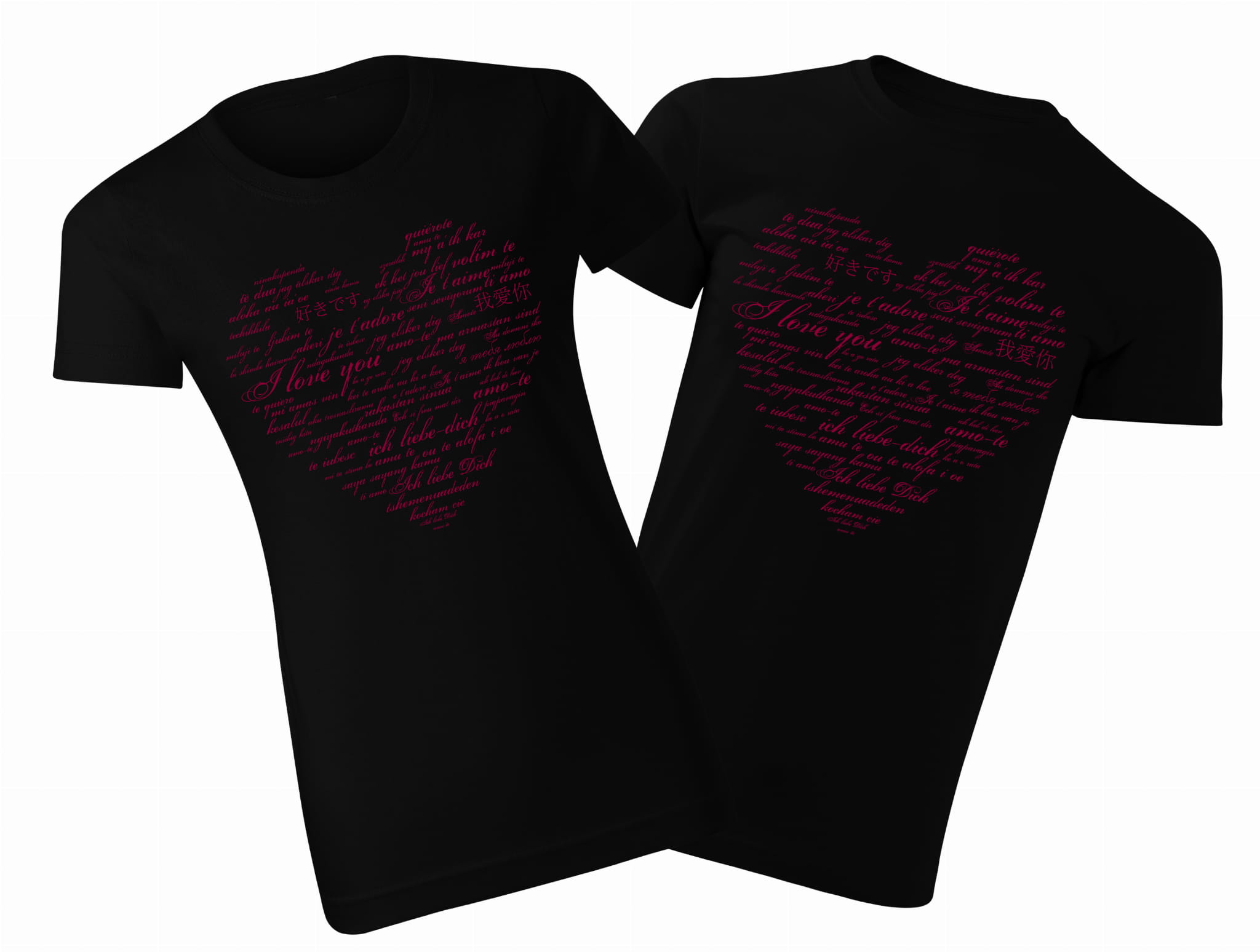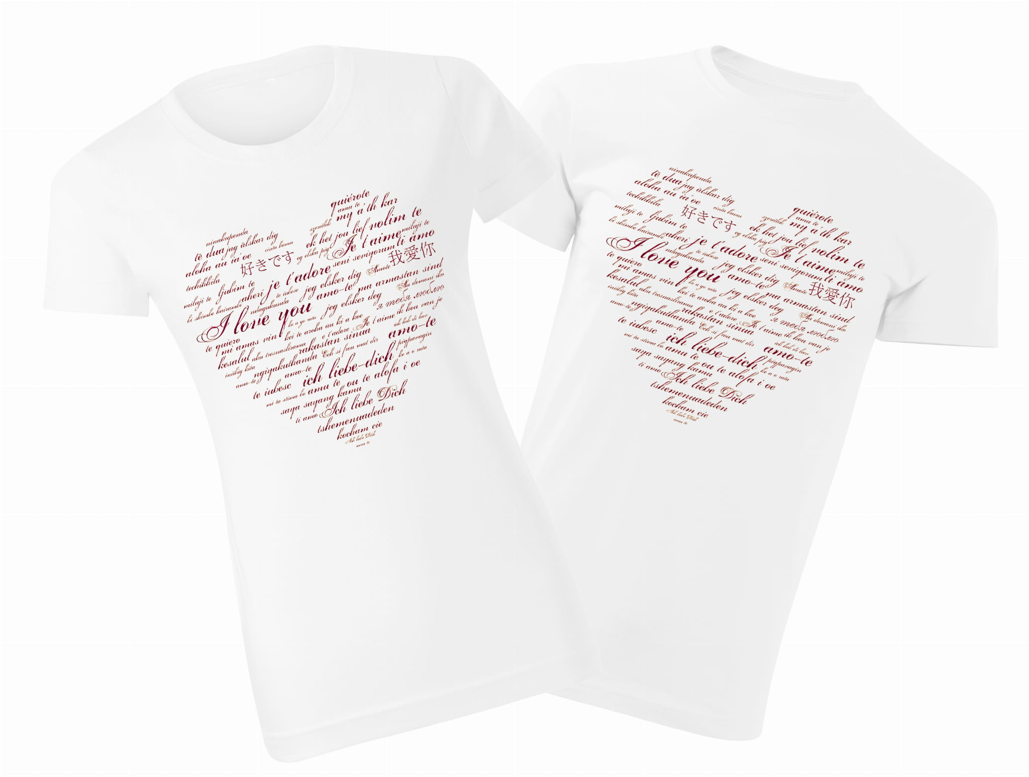Koszulki z nadrukiem serca i napisem kocham Cię w wielu językach.