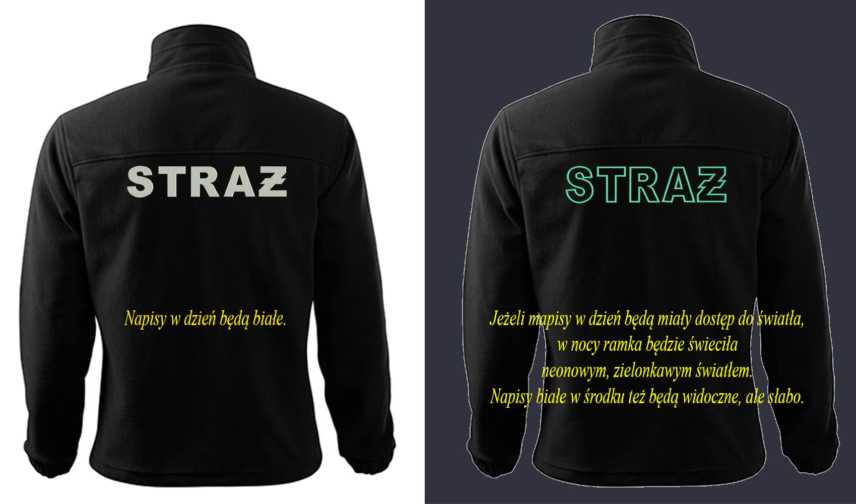 - Napis STRAŻ LUNA (napis biały, ramka biała nićmi święcącymi w ciemności zielonkawym światłem) - Uwaga za nici świecące dopłata 20 zł.